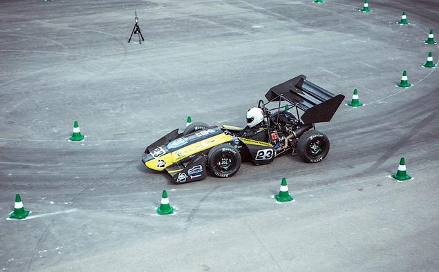 Самыми зрелищными были зачеты "Автокросс" и "Гонка на выносливость". Заезды в первой дисциплине проходили не на треке, а на парковке перед боксами. На асфальте перед гаражами команд поставили конусы, вокруг которых участники накручивали "восьмерки". Два круга по ее нижней части, потом переход на верхнюю – и тоже два круга. Главное – проехать быстро и не задеть фишки. Оценка за этот вид соревнований рассчитывается по сложной формуле (не удивляйтесь, это же соревнования студентов-технарей): (46.5 x (Tmax/Tyour) -1) / ((Tmax/Tmin) -1) + 3.5, где Tyour – "лучшее замеренное время среди команд с учетом пенализации", Tmin – "замеренное время оцениваемой команды", и так далее.
