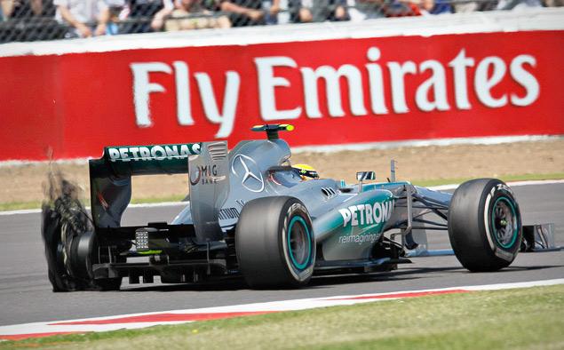 Затем Гран-при Великобритании принялся сжигать нервные клетки руководителя спортивного подразделения Pirelli Пола Хэмбри. На восьмом круге взорвалась левая задняя шина на Mercedes Льюиса Хэмилтона, на десятом – на Ferrari Фелипе Массы, на пятнадцатом – на Toro Rosso Жана-Эрика Верня. Лидерство досталось Себастьяну Феттелю, опередившему на старте Нико Росберга, но директор гонки Чарли Уайтинг выпустил на трассу лидировать другой Mercedes – "безопасный" SLS Бернда Майландера. А сам принялся раздумывать над тем, не остановить ли ему гонку.