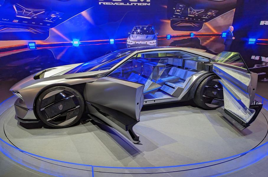 Электрический пикап Ram 1500 Revolution BEV Concept — главная бомба выставки. В эту рыночную нишу концерн Stellantis немного опаздывает: уже вовсю продаётся Ford F-150 Lightning, у дилеров General Motors очереди на GMC Hummer EV, весной к покупателям начнут поступать Chevrolet Silverado EV и GMC Denali EV... наконец, в середине года должно начаться производство Tesla Cybertruck. А вот электрический Ram — это пока лишь концепт-кар, предвосхищающий серийный электро-пикап, премьера которого запланирована на 2024 год. Фирменный стиль бренда переосмыслен в «электромобильном» ключе: светодиодные фары заключены в широченные «вилки» ходовых огней, логотип со здоровенными буквами «RAM» тоже подсвечен.
