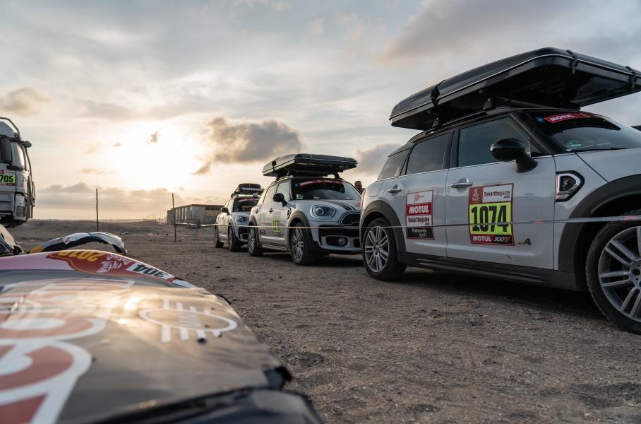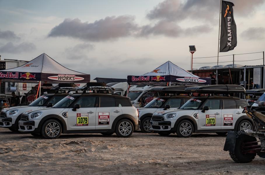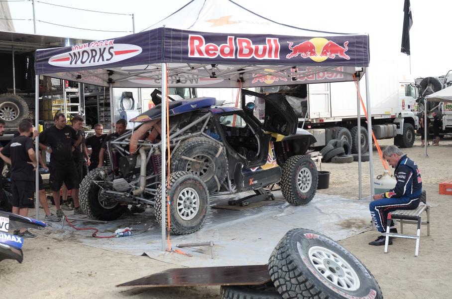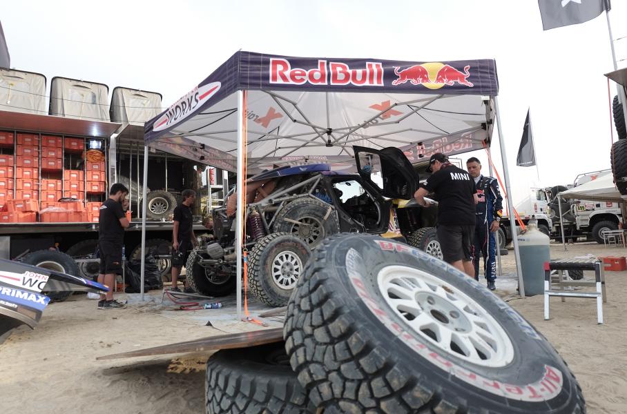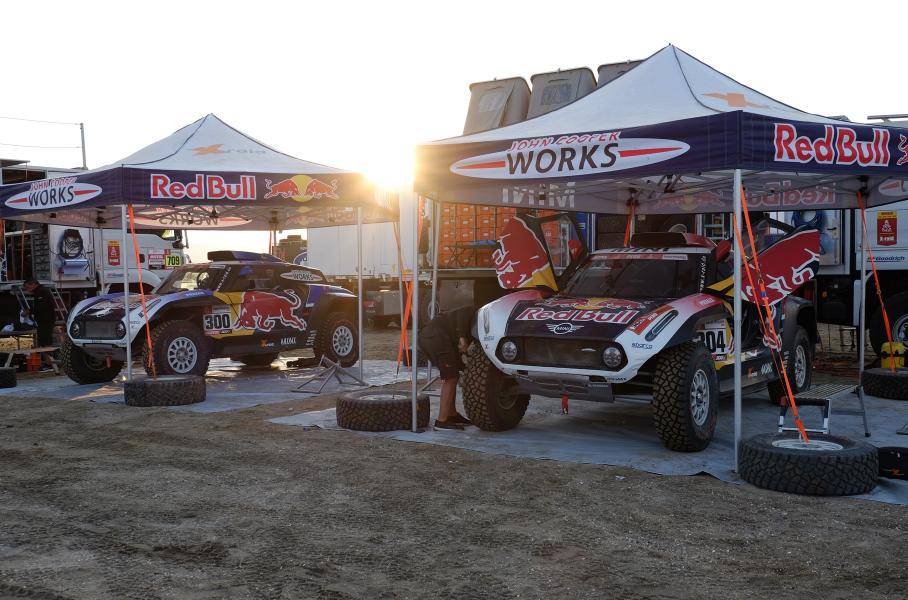 Уже на стоянке находим время, чтобы понаблюдать, как работают механики, изучить особенности организации командного пространства и побольше узнать о «боевых» MINI. Стоянка X-raid разделена на несколько зон. В первой обслуживают три багги, во второй — пять полноприводных JCW Rally, в третьей — прототип российской команды Moscow Rally Team. MINI John Cooper Works Buggy — заднеприводные, с трубчатой стальной рамой, карбон-кевларовым кузовом, длинноходной подвеской, системой подкачки колёс с управлением из салона и 355-сильными дизельными двигателями на базе серийного блока BMW объёмом 3,0 литра. Прототипы MINI John Cooper Works Rally похожи на багги, они тяжелее, но оснащены полным приводом. По правилам «Дакара», двигатели всех автомобилей должны переваривать обычное местное топливо.