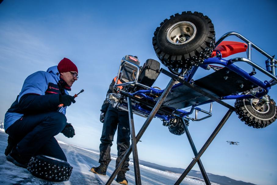 На фоне колосса забавно смотрелись картингисты — многократный призер республиканских соревнований по картингу и автокроссу, тренер сборной Иркутска по картингу Стас Лыжин и двухкратная рекордсменка России, студентка Высшей Школы Экономики Маруся Леонтьева.