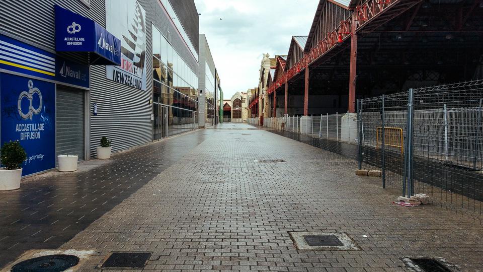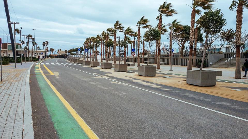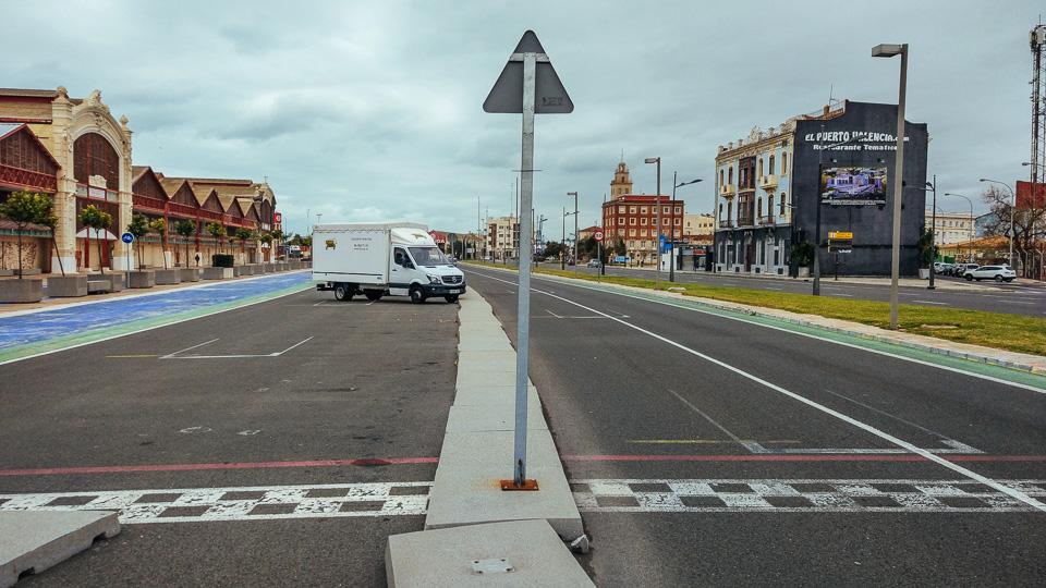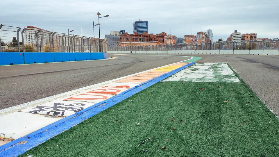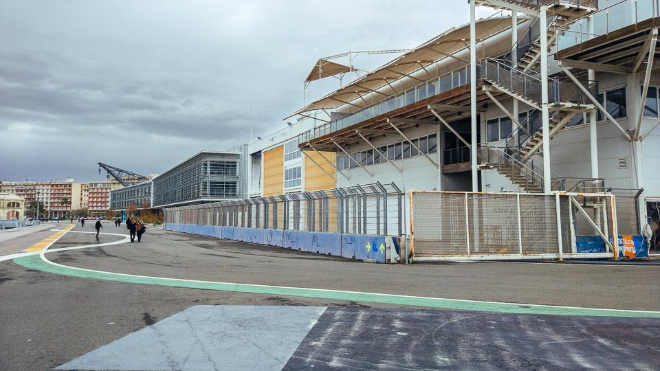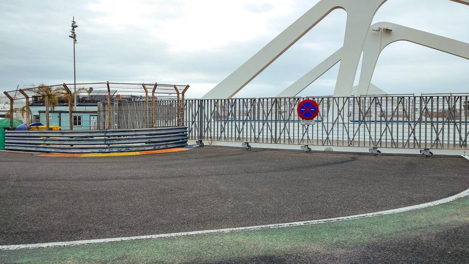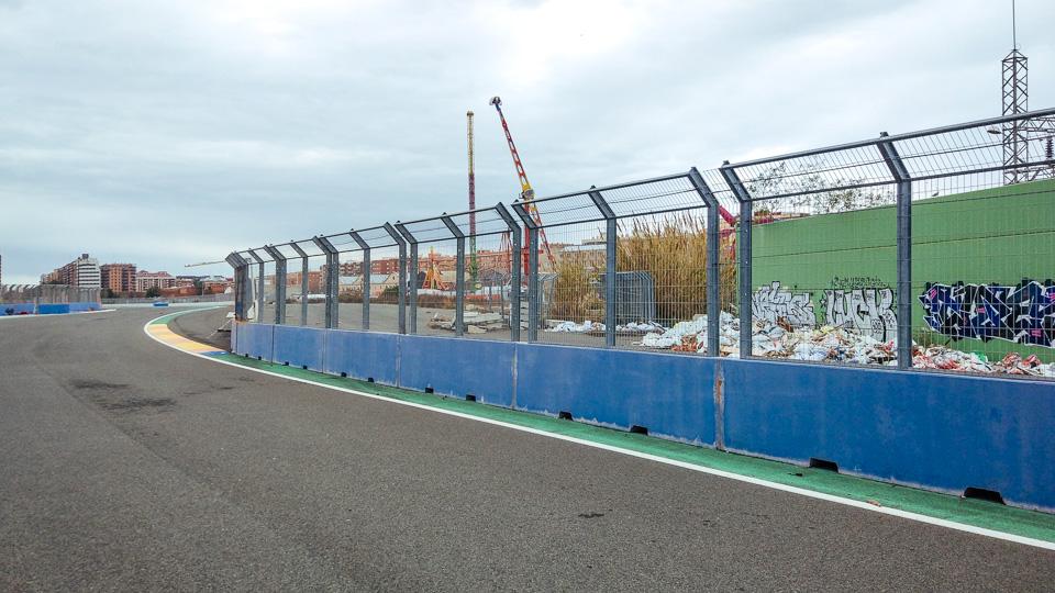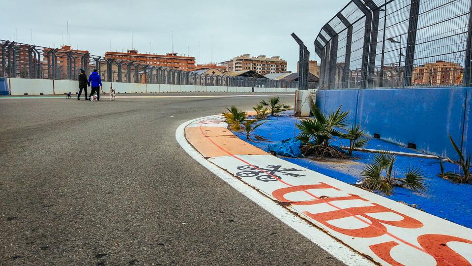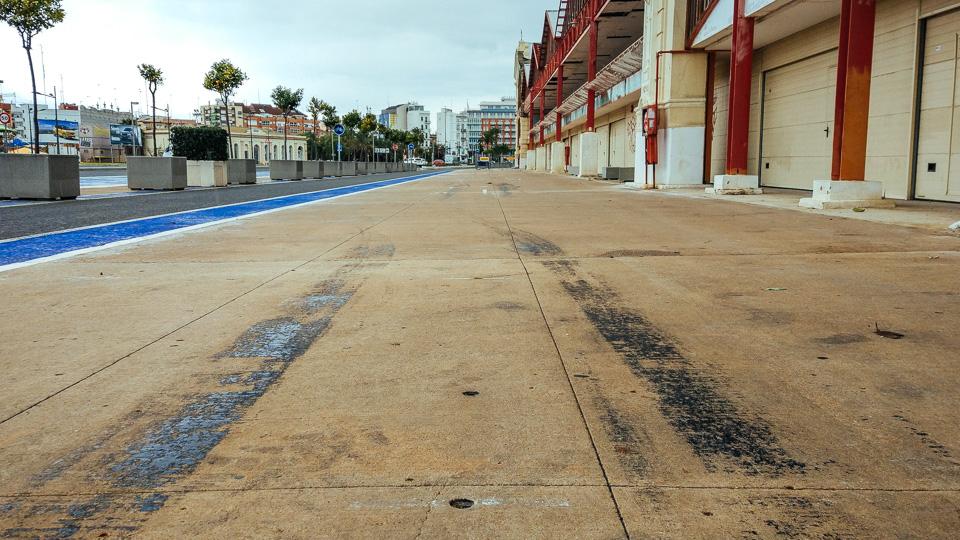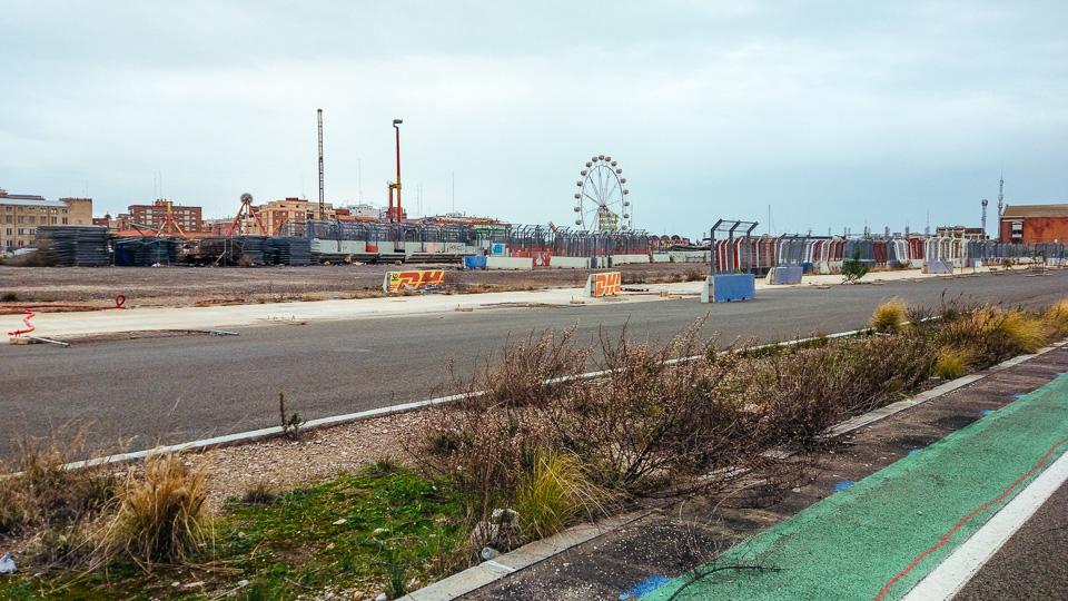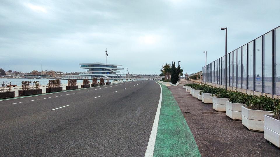 Для части конфигурации Гран-при Европы использовались обычные городские улицы, по которым в остальное время ездили машины. Зелено-белая разметка границ трассы до сих пор на месте, поэтому, при желании, по ней можно сделать полный круг пешком. На фото – занесенный песком отрезок между 6 и 8 поворотами.