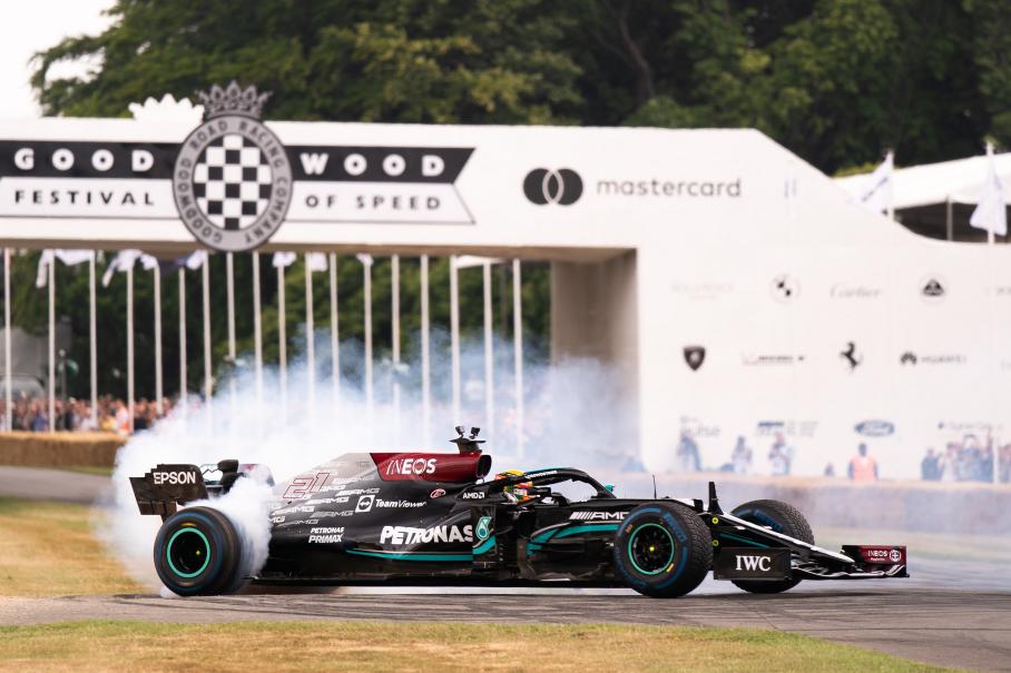 В Гудвудском фестивале участвовали пять команд Формулы-1. Конюшня Mercedes AMG Petronas F1 привезла чемпионский болид W10 EQ Power+. Это современная машина 2019 года — то есть представитель текущего поколения с турбомоторами V6 1.6 и гибридной трансмиссией. На фото крутит «пончики» экс-пилот Формулы-1, мексиканец Эстебан Гутьеррез.