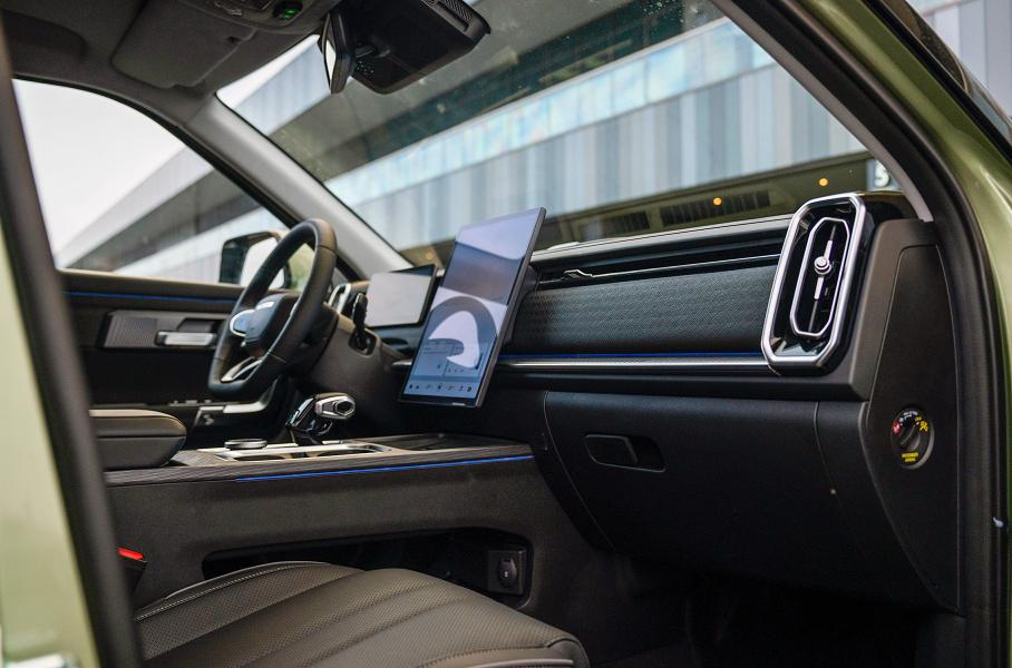J7 любит прямые углы. Он выглядит, как массивный параллелепипед, над которым возвышается легковесная надстройка пассажирского салона в стиле Range Rover Evoque. Кажется, что его передний бампер шире, чем весь автомобиль, а слово «аэродинамика» рядом с ним можно произносить исключительно стыдливо и вполголоса. Хотя снижать сопротивление воздуха призваны «потайные» ручки дверей: на скорости они утапливаются в кузов, как теперь всё чаще бывает у дорогих машин. Jaecoo в премиум не лезет, но красивый жест дороже денег.