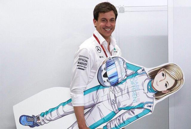 Тото Вольфф очень любит свою жену Сьюзи и всюду возит ее с собой на гонки. Но какая-то подозрительная у него улыбка, не находите?