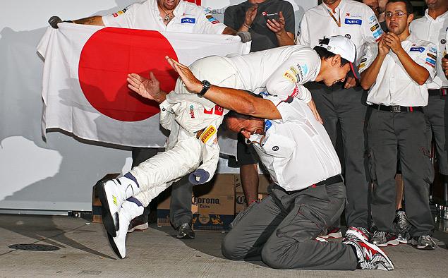 Сказочный уикенд для Камуи Кобаяси. Первый подиум, добытый на домашней трассе, – казалось, о лучшем и мечтать было нельзя. Конечно, японцу немного повезло. В первые десять секунд после старта он лишился сразу четырех возможных соперников в борьбе за подиум. А с остальной работой Коба справился на «отлично». Возможно, третьим местом на Гран-при Япоини, Камуи обеспечил себе контракт с Sauber на будущий сезон.