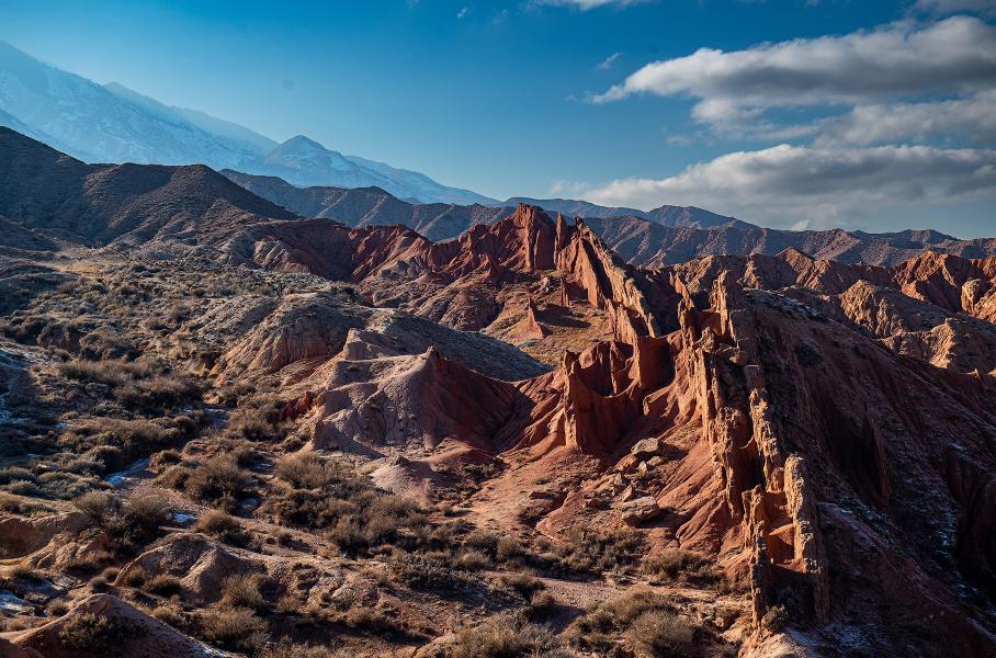 Главная достопримечательность южного берега — каньон Сказка, расположенный неподалеку от села Тосор. Это причудливый марсианский пейзаж: скалы, горы, столбы и пики из песчаника и красной глины, цвета которых ежечасно меняются в зависимости от освещения, а формы — из-за естественных погодных условий и эрозии. Тем не менее, по ним можно свободно гулять, забираться на вершины и наслаждаться видами. А самое главное — ни одного туриста, кроме нас. Красота!