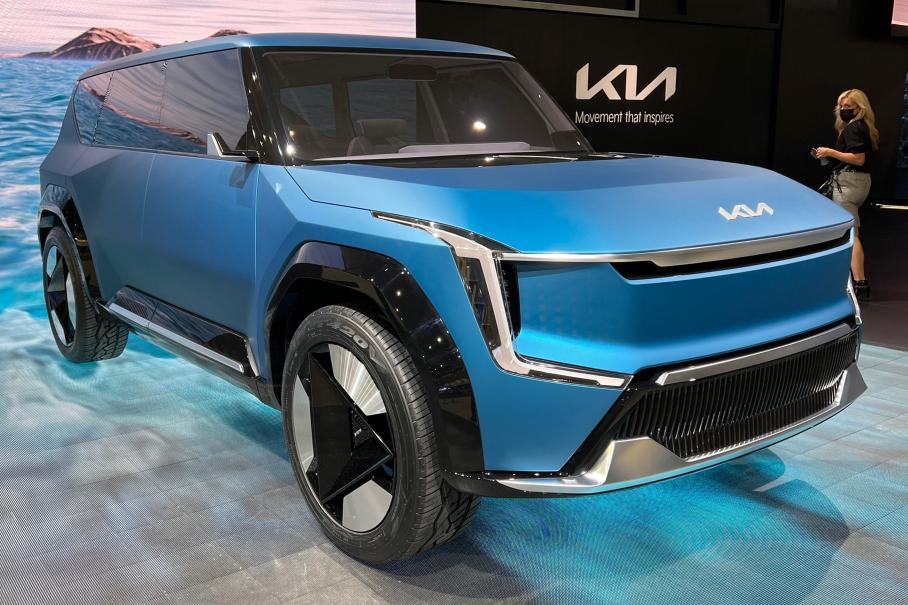 Концепт-кар Kia EV9 предвосхищает одноимённую серийную машину — флагмана электрической линейки Kia. Громадный кроссовер длиной около пяти метров получил трехрядный салон, распашные задние двери, 22-дюймовые диски, камеры вместо наружных зеркал и солнечную батарею в капоте.