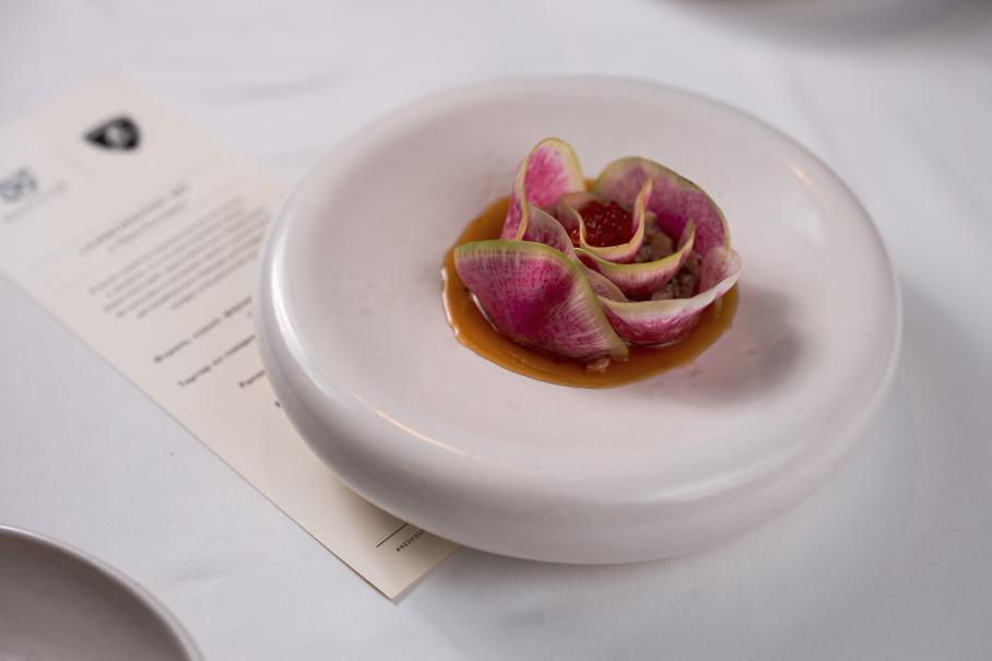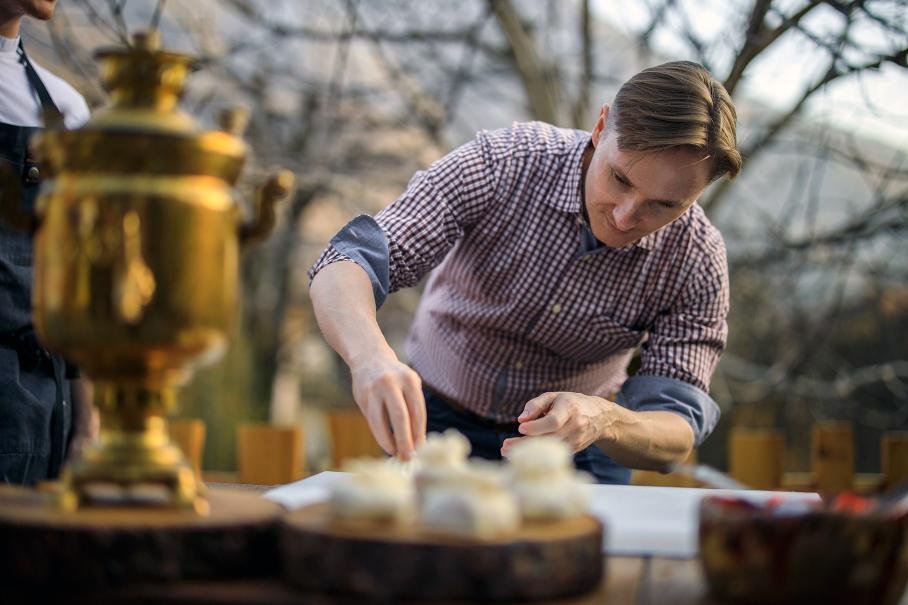 Мои коллеги из глянцевых изданий намного лучше ориентируются в теме и таки заводят с Юрием беседу о высокой кухне. Я бывал в мишленовских ресторанах, но не могу поддержать этот разговор. Более того, если бы я присоединился не с начала, подумал бы, что речь шла о театре. Ведь собеседники говорили не о еде, а о впечатлениях, переживаниях, смыслах… Ну знаете, как если бы я в разговоре с петролхэдами завел свою старую пластинку, что W12 никогда не будет звучать как V8, то наверно заставил бы страдать случайно попавшего в компанию архитектора, спортсмена или шеф-повара. С той разницей, что я-то как раз не страдал, а лепил хинкали из свежей клубники и рисового теста. С этим справится и любитель круггетсов с чебупелями. А из чего приготовил десерт сам Юрий? Голубика, тархун и жженая ряженка. Хм…