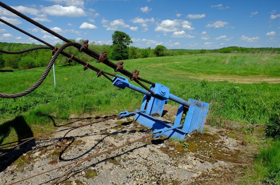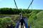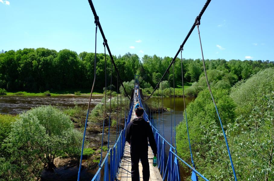 Следующая точка куда интересней — это длинный подвесной мост через реку Угру рядом с Товарково. Дети ехали сюда целенаправленно, потому без раздумий рванули на другую сторону. Идти не страшно, плюс тренировка для вестибулярного аппарата неплохая. Сложно поверить, что весной 2013-го здесь было наводнение, и подтопило даже пешеходную часть. На правом берегу начинается национальный парк «Угра». А ещё в ста метрах от моста стоит отреставрированная церковь Рождества Христова, заложенная в 1900 году. Вниз по течению — мемориал в честь Великого стояния на реке Угре осенью 1480 года.