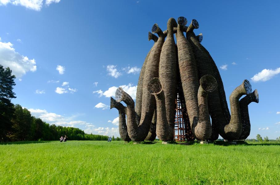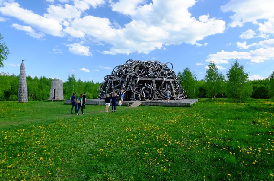 Это похожий на декорацию к фильму про инопланетное вторжение Бобур (металлический каркас высотой 22 метра, оплетённый берёзовой лозой); огромный деревянный мозг «Вселенский разум» (изогнутые балки с зеркальными пластинами); батут «Скорая Тропа»; и, конечно же, Маяк (собран за три месяца из ветвей вязов без единого гвоздя). Из окна машины или на бегу смотрим на арку «Белые ворота»; «Позолоченного тельца», символизирующего быка с Уолл-стрит; и ротонду с множеством дверей.