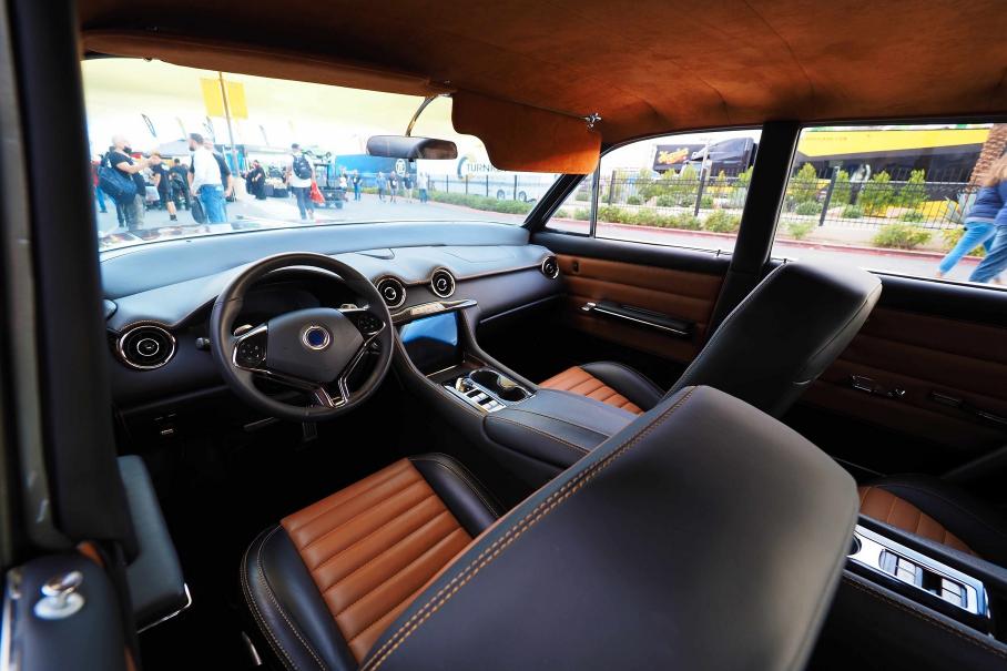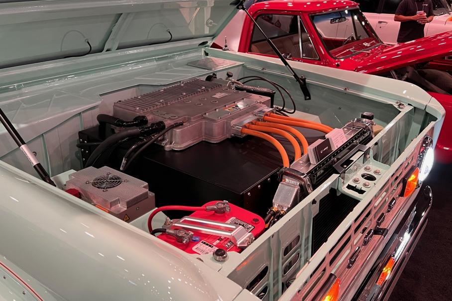 Один из самых интересных электро-рестомодов выкатила компания Ford: это светло-серый пикап Ford F-100 Eluminator. Пикап 1978 года скрестили с «начинкой» от электрического кроссовера Ford Mustang Mach E — от него заимствованы два электромотора мощностью 280 сил каждый, силовая электроника, батарея и подвески. Правда, серийный электромобиль имеет конструкцию с несущим кузовом, а исторический пикап — рамный, с мостом на рессорах сзади. Поэтому специально для этого проекта мастерской Roadster Shop пришлось заказать оригинальное рамное шасси, рассчитанное на установку батареи под днищем и с точками крепления для независимой подвески.
