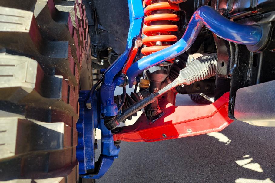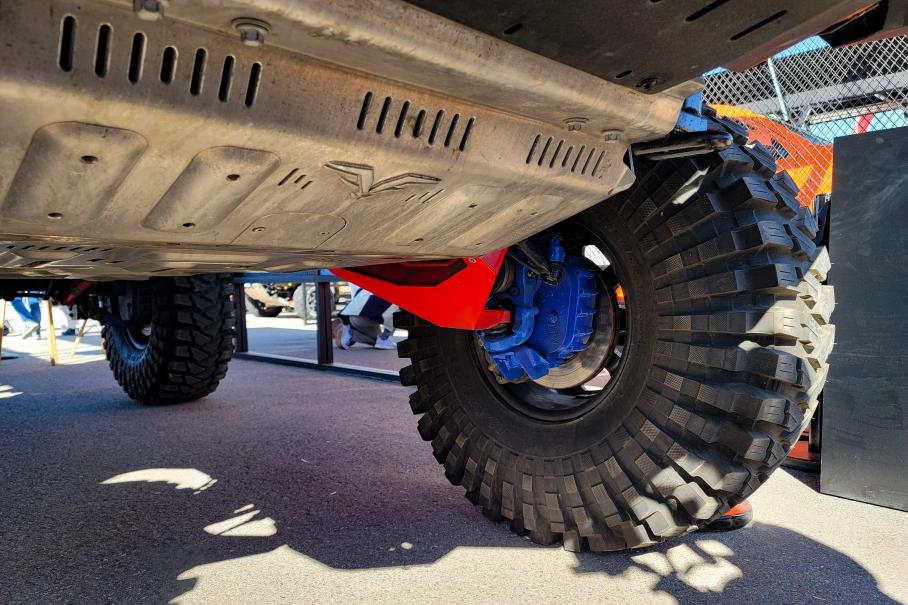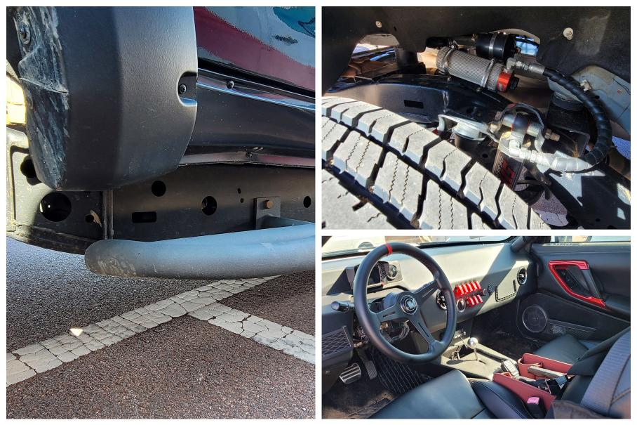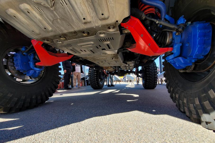 Поэтому я даже не смог выяснить характеристики самого сумасшедшего лифт-проекта всего фестиваля! Прикреплённый к Танку на огромных 42-х «Трепадорах» специалист мог объясняться с иностранцами только жестами. Поэтому предлагаю вместе рассмотреть фотографии в галерее выше, на которых можно увидеть портальные редукторы, довольно дикий угол излома передних приводов, амортизаторы с выносными резервуарами (сзади — по два на колесо, один с бачком и один обычный), мощные кованые рычаги.