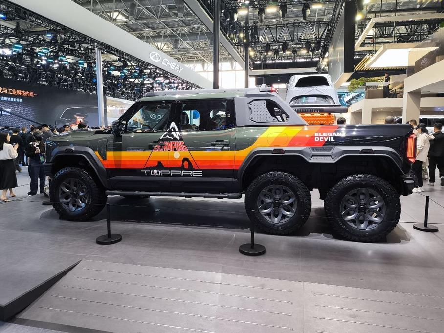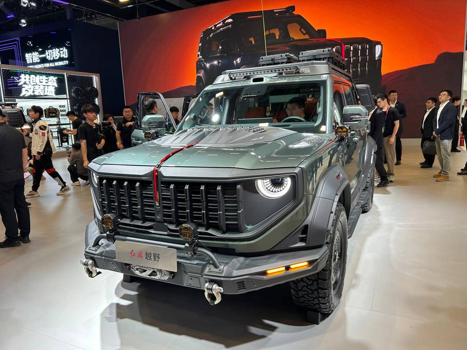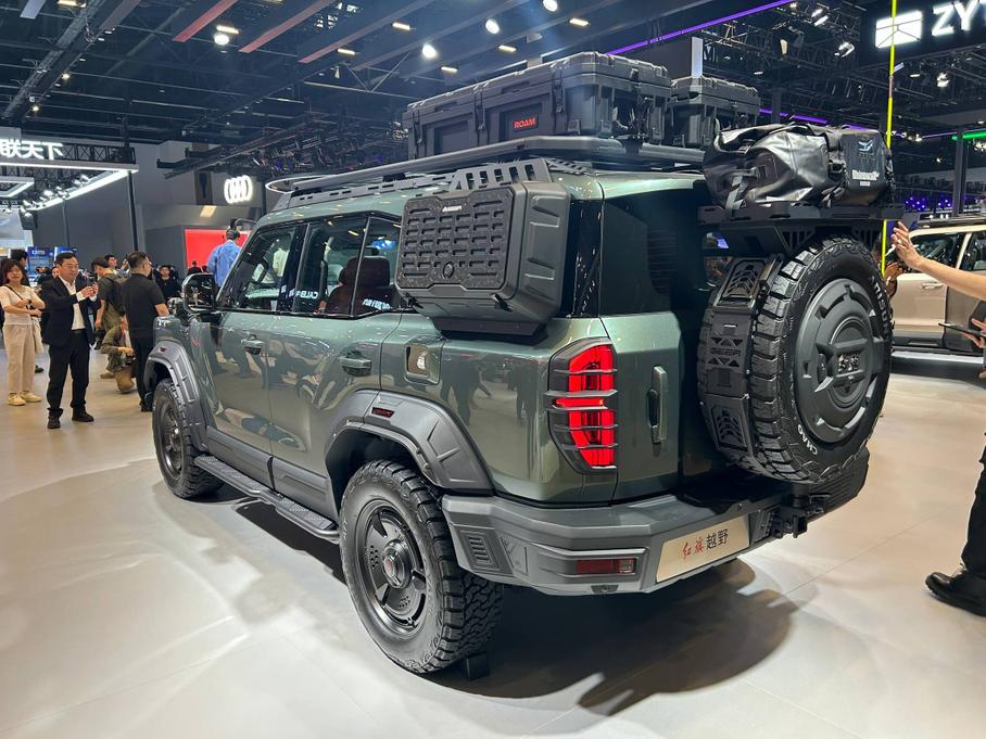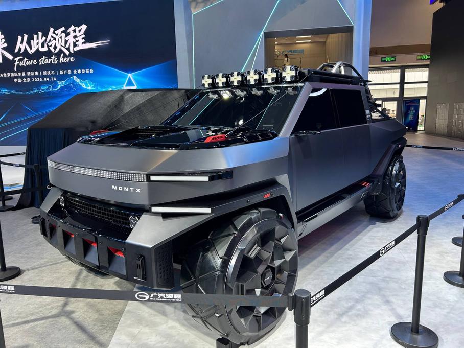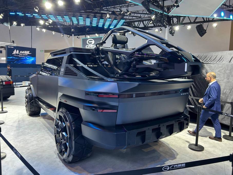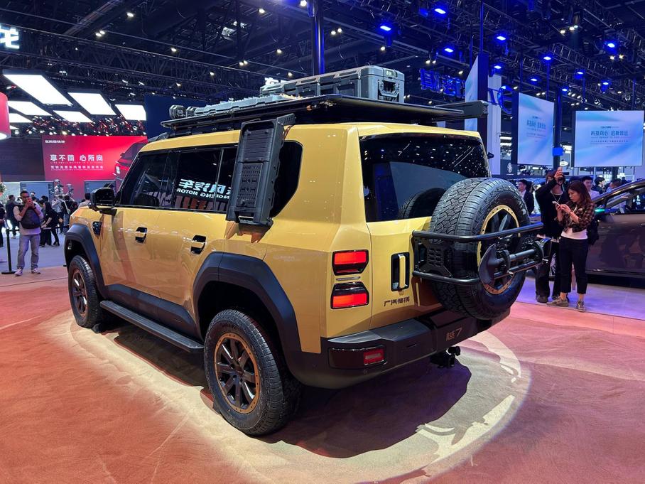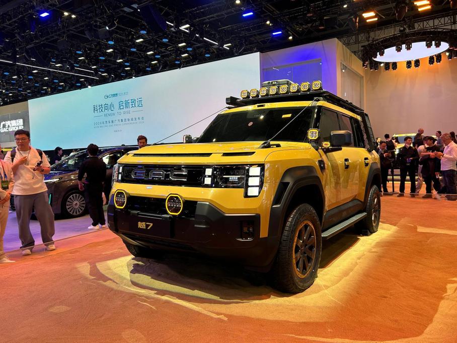Стенд GAC на Пекинском автосалоне украшает рамный подключаемый гибридный внедорожник Yue 7 (ранее известный как T75), который официально дебютировал на выставке. Дизайн — квадратный и агрессивный: крупные колёсные арки, запасное колесо на пятой двери и шесть дополнительных фар на крыше.
