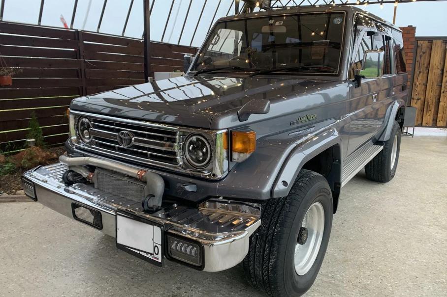 Для полноты картины упомянем и почти стандартную импортированную из Японии семидесятку в не самом распространённом у нас кузове пикап. Она выпущена в 2015 году и успела проехать 181 тысячу километров. Для Toyota Land Criuser 70 это, как говорится, только обкатка — неудивительно, что кузов в родной краске, а салон выглядит безупречно. Из тюнинга — только джентельменский набор в виде кунга, колёс и неагрессивного силового обвеса. Продаётся автомобиль за 4 миллиона рублей.