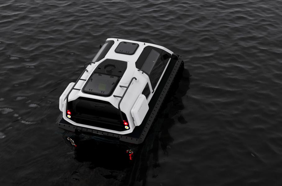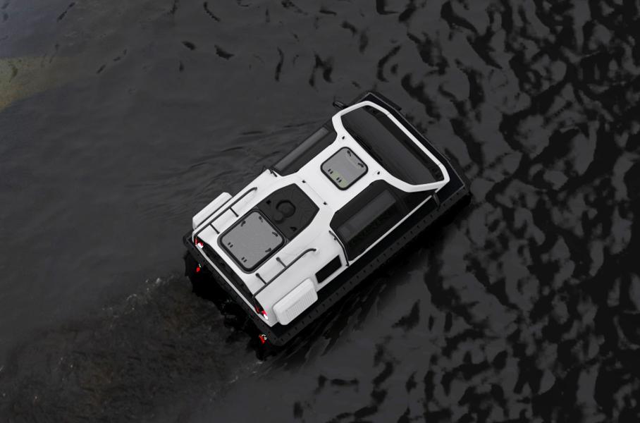 Вид у вездехода весьма футуристический. Но это не просто визионерский концепт — его конструкция полностью удовлетворяет ГОСТу 34095-2017 «Снегоболотоходы колесные малогабаритные с органами управления автомобильного типа. Требования безопасности и методы испытаний».