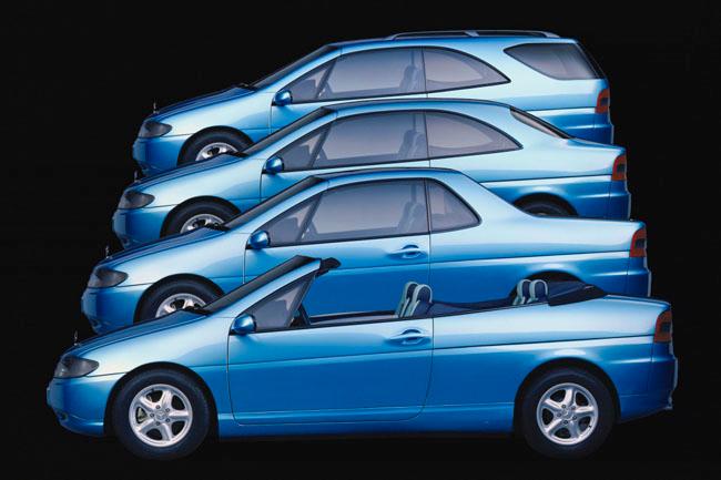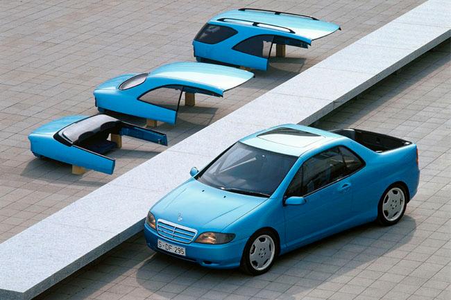 Чуть раньше проблему хранения съемных частей кузова попытался решить «Мерседес». Представленный на Женевском автосалоне в 1995 году прототип VRC (Vario Research Car) мог превращаться в купе, универсал, кабриолет или пикап. Компактный двухдверный «Мерседес-трансформер» имел цельный кузов с убираемой крышей, съемными боковыми панелями и задней секцией, выполненными из углепластика.