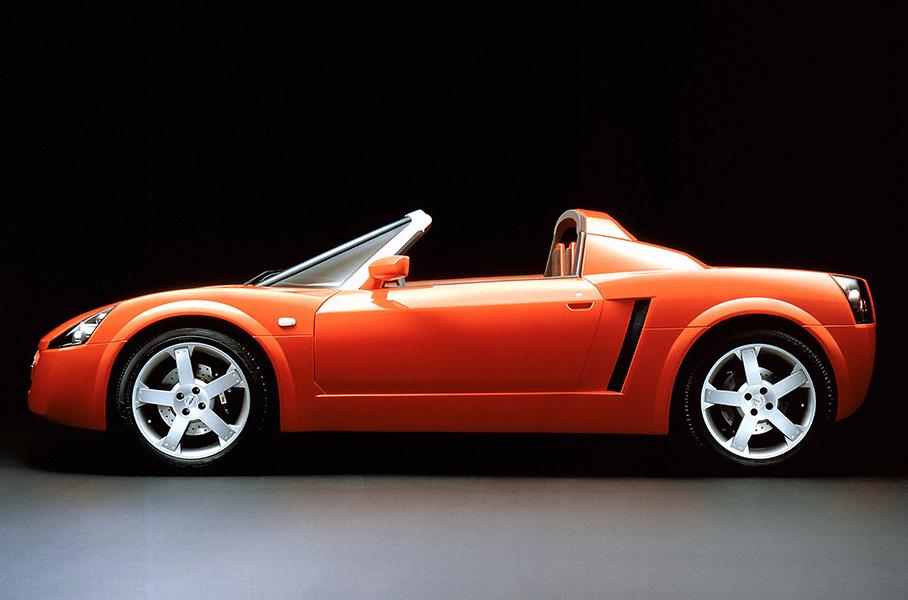 Напоследок — несколько важных концепт-каров, одним из которых был Opel Speedster. Впоследствии этот автомобиль, претерпев минимальные изменения, станет серийным, однако продержится на конвейере совсем недолго, с 2001 по 2005 год. Построенный совместно с Lotus, Speedster был выгоден и британцам, и General Motors: Lotus сэкономили на создании шасси для Elise второго поколения, а Opel получил эффектный и эффективный спорткар.