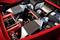 Еще раз напомним: у 308 «восьмерка» размещена поперечно. На 288 GTO картина обратная: продольный агрегат с «сухим» картером, уменьшенным на 1 мм диаметром цилиндра и системой впрыска Weber-Marelli. Ключевые характеристики отражены в названии: литраж «два и восемь» (фактический — 2855 «кубиков», согласно требованиям FIA для турбомоторов) плюс восемь цилиндров. Ответ на вопрос, к чему такие компоновочные сложности, очевиден — достаточно увидеть два турбокомпрессора IHI и интеркулеры Behr. При поперечном расположении ДВС для них не хватило бы пространства. Пятиступенчатая коробка передач пристыкована сзади.