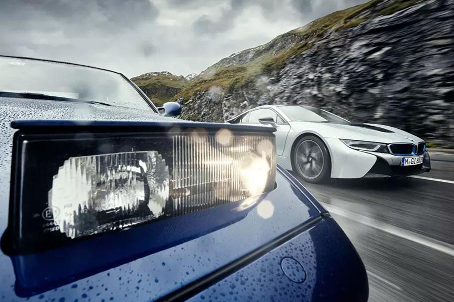 В конце восьмидесятых баварцы огрызнулись на дорогие купе класса гран-туризмо и выкатили эпохальную двухдверку восьмой серии. Ту самую, что по сей день коллекционирует изумленные взгляды и взирает на поклонников с пожелтевших постеров. Иногда фотография — максимум, что можно себе позволить. Цены на «восьмерку» нынче ого-го! Но нам повезло завязать романтическое знакомство с 850 CSi цвета «Alaska blau» и 12-цилиндровым S70B56 мощностью 380 л.с. А в пару ей подобрали гибрид i8.