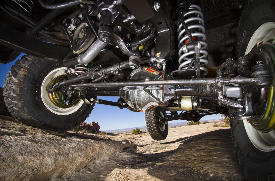 Впрочем, всё это лишь вершина айсберга. Шасси и силовой агрегат — вот где самые деликатесы! Автомобиль имеет в своей основе усиленную раму и увеличенную на 51 мм колесную базу. На смену заводской рессорной подвеске пришла пружинная, с передним мостом Dynatrack Pro-rock 60 и Dynatrack Pro-rock 80 сзади. Kaiser Jeep M-715 оснащался рядной 3,8-литровой «шестеркой», в то время как шоу-кар вооружен 6,2-литровым компрессорным V8 Hellcrate Hemi, развивающим свыше 700 лошадиных сил.