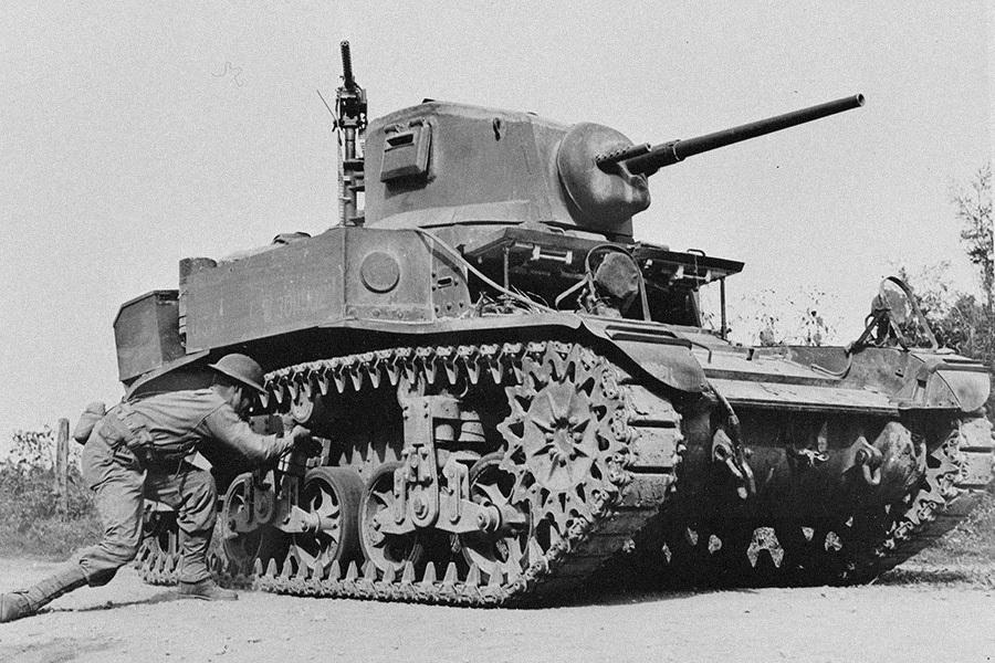 А вот на американские боевые машины начального периода войны без слез и не взглянешь! Возьмите хотя бы самый массовый из всех «янки-танков» M3 Stuart — высокий силуэт, клепанная броня, смехотворное вооружение, слабая динамика на пересеченной местности, бензиновый мотор, склонный к возгоранию...