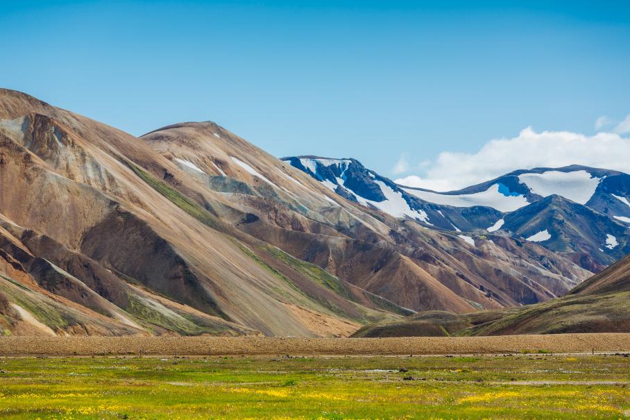 Затем постапокалиптический пейзаж сменяется сиреневыми люпинами, а впереди из-за низко висящих облаков вдруг открываются скалистые горы, холмы и заснеженные пики вулканов, которые освещает солнце. Съезжайте с асфальта в их сторону — и вот здесь уже есть реки, броды, пески, геотермальные источники и выветренные риолитовые склоны гор различных цветов: красный, зеленый, розовый, черный, белый.