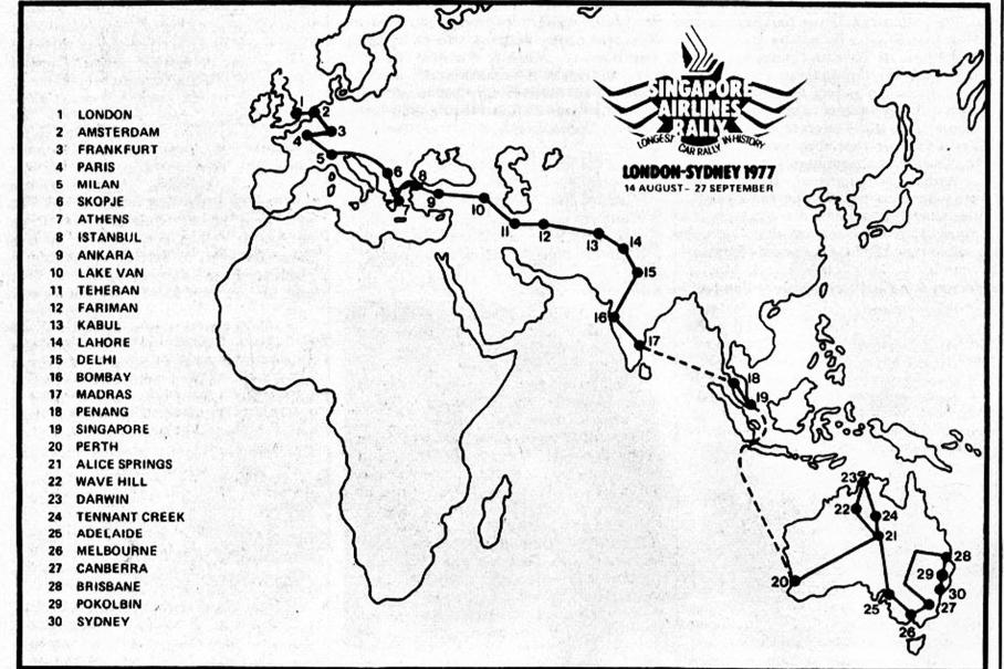 Гонка получила официальное имя «Сингапур эйрлайнс ралли Лондон–Сидней» и в честь 30-летнего юбилея авиакомпании проходила по дорогам трех континентов. Символизма вообще хватало. За 30 дней участники должны были отметиться на 30 пунктах контроля времени (КВ) и в борьбе за главный приз равный 30 тысячам австралийских долларов максимально быстро преодолеть 30 тысяч километров.
