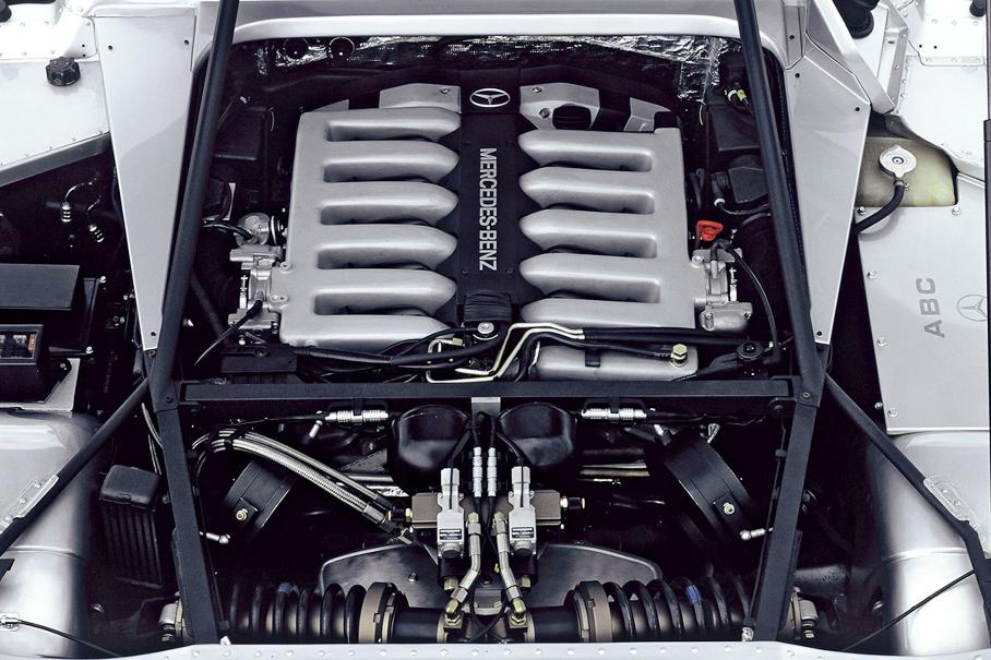 Поскольку никакой регламент не связывал мерседесовцам руки, последняя итерация С111 выглядела сугубо как машина для рекордов скорости — такие на дорогах точно не увидишь. Аэродинамический пакет стал еще более совершенным: появились развитые передний и задний сплиттеры, стабилизирующие плавники… И был заменен двигатель — место 5-цилиндрового дизеля занял 4,8-литровый бензиновый V8 с парой турбин ККК. 500 л.с. и 600 Нм приводили заднюю ось через механическую коробку передач с трехдисковым сцеплением.