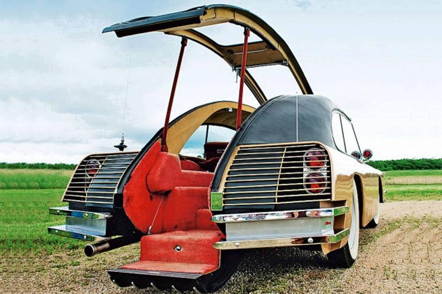 Были и другие экзотические особенности, довольно безумные. Моторный щит был якобы изготовлен из алюминиево-вольфрамового сплава. Двери не распахивались или сдвигались, но отъезжали в стороны на телескопических направляющих. А жёсткая крыша при помощи несложного механизма складывалась — две половинки размещались на крышке багажного отсека.