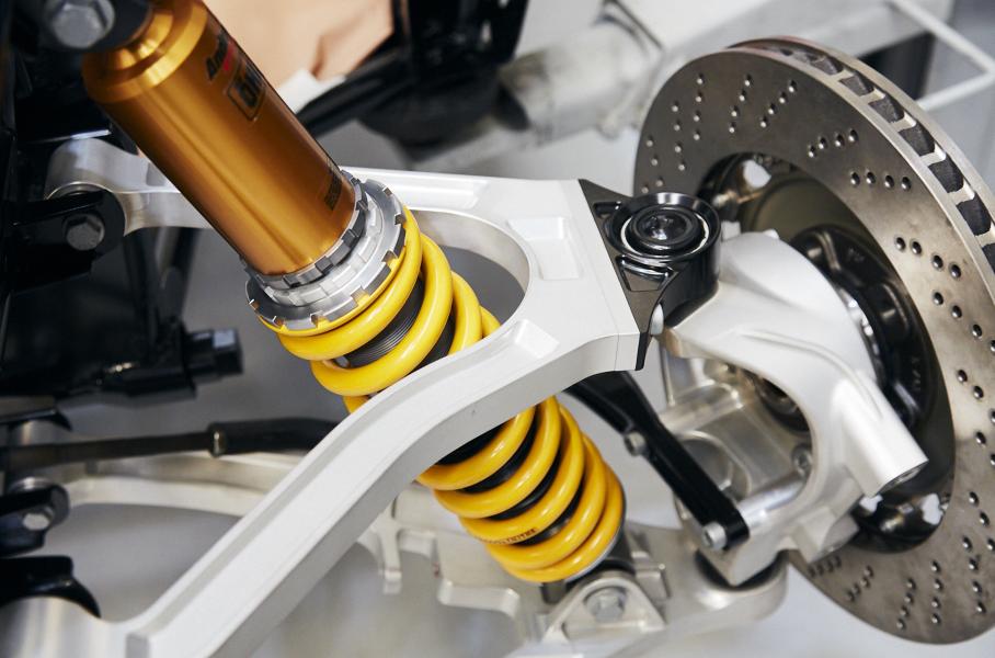 Подвеска на двойных поперечных рычагах с амортизаторами шведских гуру Öhlins. Сзади – по два демпфирующих элемента на колесо. Тормозная система от Brembo: 365-миллиметровые диски и четырехпоршневые суппорты. Передние колеса 18-дюймовые, на задней оси — диаметром 19 дюймов.