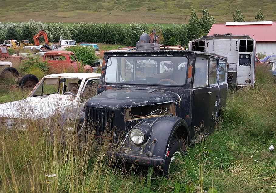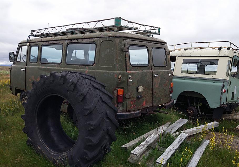 Сильно гонять, впрочем, и смысла никакого нет. Да, Исландия достаточно монументальна для того, чтобы вы смогли ее рассмотреть даже на глупой скорости, но рукотворные детали можно случайно и упустить. Например, гниющие на обочине «Дефендеры», рядом с которыми в грунт понемногу врастает и… наша родная «Буханка»! Судя по деталям, она тут живет как минимум с середины восьмидесятых. «Ну ладно, – думаем. – Нет в мире такой страны, где не нашлось бы советских вездеходов. Бывает»