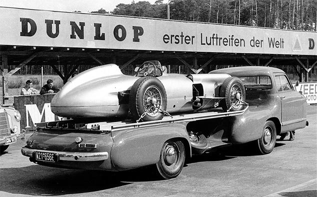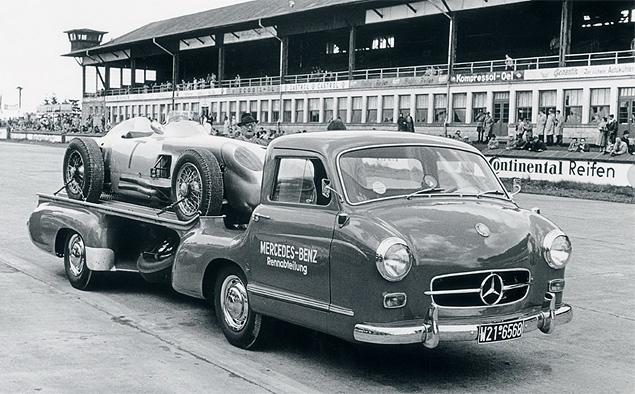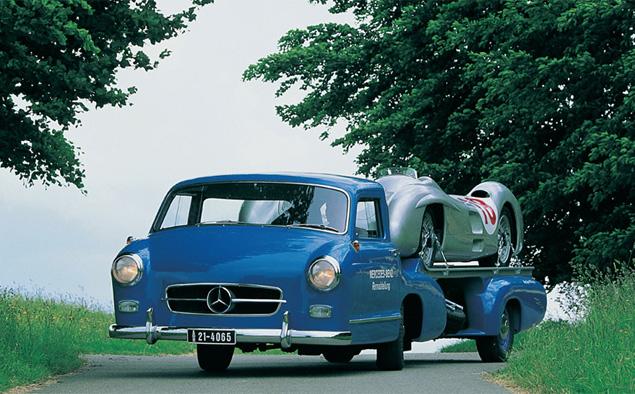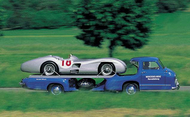 Пережив разрушительную войну и запрет на участие в гонках, Mercedes-Benz лишь в начале 50-х смог вернуться в автоспорт. Гоночный Mercedes-Benz 300 SL (W194) принес марке победу в Ле-Мане и в гонке La Carrera Panamericana, но это была только разминка. Настоящая экспансия была намечена на 1954-1955 годы, когда на трассы вышли формульный болид W196 и прототип 300 SLR, получивший индекс W196S. Самый мощный мотор, самая лучшая аэродинамика, самые сильные гонщики (Фанхио, Мосс, Ланг) и самый большой бюджет. Неудивительно, что и грузовик-транспортер тоже понадобился самый-самый.