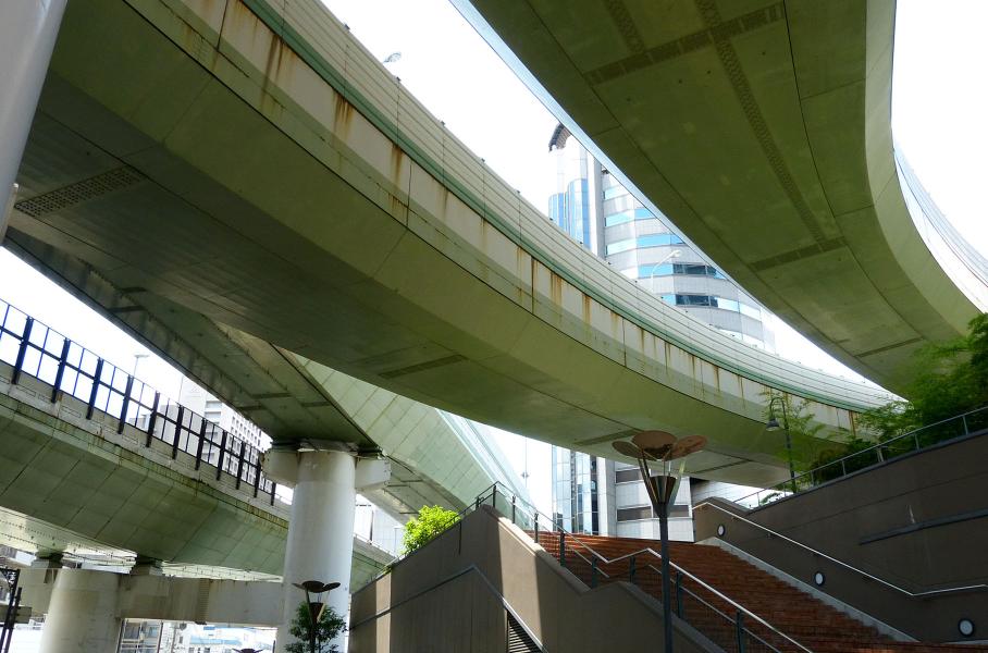 Необычный тоннель, расположенный в японском мегаполисе Осака, является одним из примеров компромисса местных властей и строителей коммерческой недвижимости. В начале 1980-х годов при проектировании нового участка путепровода Ханшин выяснилось, что на месте, где должна проходить одна из развязок дороги, уже запланирована и согласована постройка 16-этажного офисного здания, «обойти» или «подкопаться» под которое не представляется возможным.