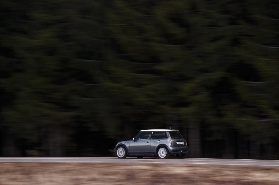 На прямиках пилоту Cooper S тоже есть чем заняться. На этом поколении Mini установлен компрессорный двигатель Tritec (совместная разработка Chrysler-Rover/BMW) объёмом 1,6 литра и с отдачей 163 л.с./210 Н∙м. Тяга не будоражит, но покоряет плотностью и уверенным нарастанием, особенно в диапазоне 4,5–6 тысяч оборотов мотора. А на момент публикации в автомобиле установлен модифицированный шкив компрессора, что дало около 200 сил мощности — динамика должна получиться сильно бодрее, чем было в день съёмки.