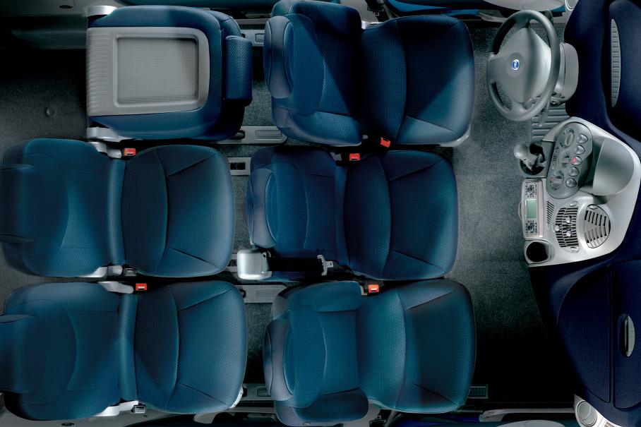 Multipla, как и Bravo/Brava построенная на тележке FIAT C1 — сразу заходила с козыря. В салоне итальянца было шесть мест — по три индивидуальных кресла в каждом из рядов. Не забудем и про огромный запас воздуха над головой и в ногах — спасибо вертикальной посадке, высокой крыше и большой габаритной ширине: плюс 16 см к тому же «Сценику».