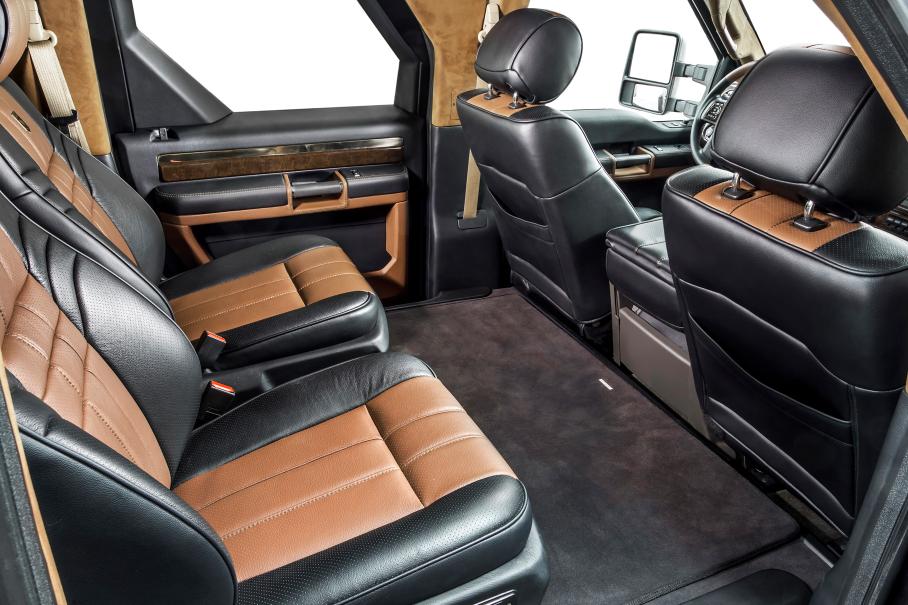Сейф на колесах оснащен фордовскими двигателями — 6,7-литровым турбодизельным Power Stroke V8 мощностью 300 л.с. и 362-сильным бензиновым V10 объемом 6,8 литра. Коробка передач — пятиступенчатый «автомат». Снаряженная масса чуть-чуть не дотягивает до 6 тонн, а полная до 9 тонн.
