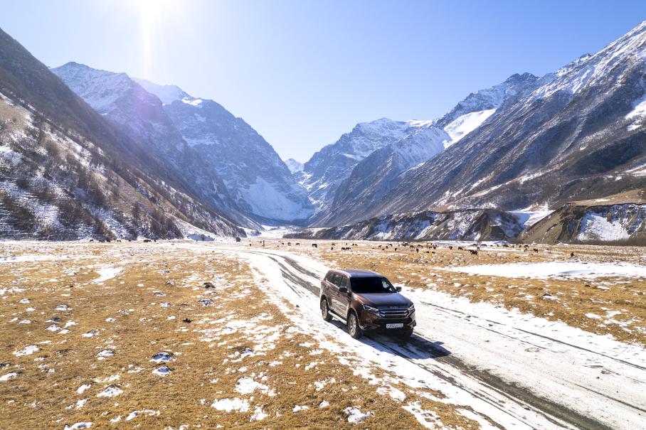 Тем более, что в конструкции Mu-X складывается заветное комбо: задний привод, почти полностью отключаемая электроника и возможность не особенно внимательно смотреть на спидометр и под колёса. Поэтому, когда свежеотсыпанный перевал Саварафцаг (ещё в августе он был закрыт для сквозного проезда) предстал в ветровом стекле всей красотой своих заснеженных виражей, устоять было сложно.