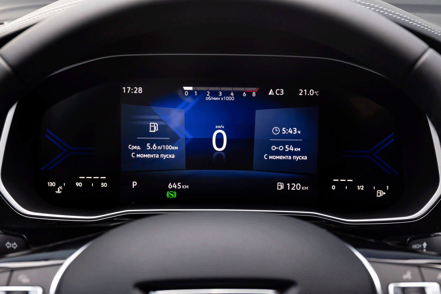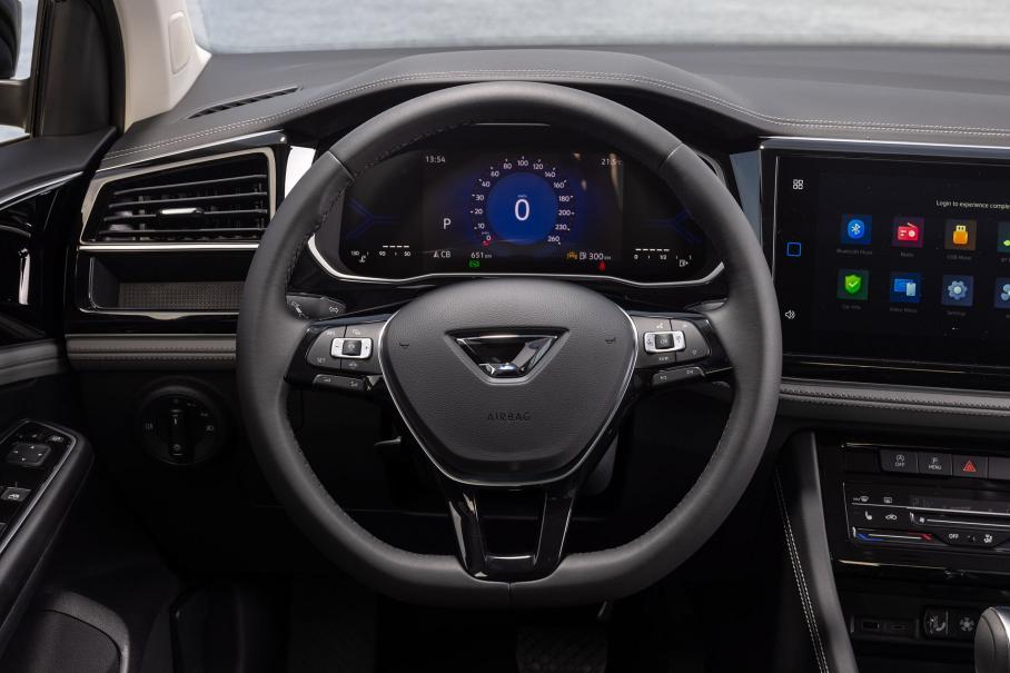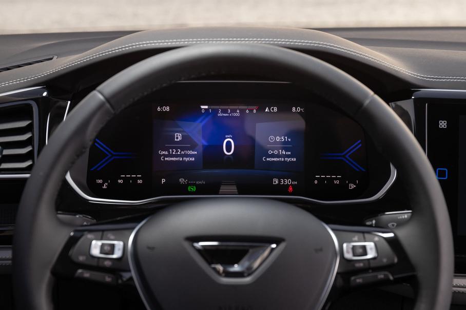 В остальном всё хорошо знакомо — вокруг водителя «всефольксвагеновская» фурнитура, включая руль, подрулевые рычажки, блок климата, селектор коробки передач и различные кнопочки. Сидеть удобно, обзорность хорошая и всё на своих местах, без лишней вычурности, как это любят сейчас делать многие китайские производители. Электронная приборка простая и не перегружена информацией, а меню борткомпьютера переведено на русский. Хотя мультимедийный комплекс и был обновлён, пока так и остался на английском.