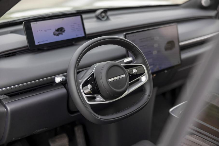 Про полностью сенсорный салон, включая открывание бардачка через экран, регулировку руля и зеркал барабанчиками на спицах, нефиксируемые поворотники и кнопку аварийки на потолке можно даже не говорить — увы, Exlantix прилежно следует всем дурацким трендам. И зачем, для чего вместо нормального обода тут гигантская сушка-челночок? Рейка-то самая обычная, 2,5 оборота от упора до упора — поэтому при любой парковке баранка (вот он, тот самый момент, когда можно употребить это слово без кавычек!) успевает предательски уйти из-под рук. К чему это может привести в экстренной ситуации, даже думать не хочется.