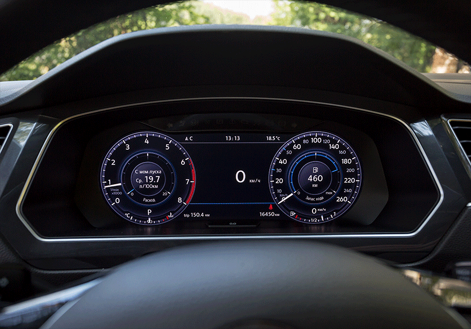 А уж с таким салоном, как у нашей машины, об унынии говорить и вовсе зазорно. Оранжевая кожа на сидениях и дверях беззастенчиво крадет ваше внимание, отвлекая его от стандартных фольксвагеновских элементов, да и полностью цифровая приборка на машинах такого класса пока редкость и радость. Хотя я еще долго не устану ругать этот щиток за перегруженность и не самый логичный интерфейс.