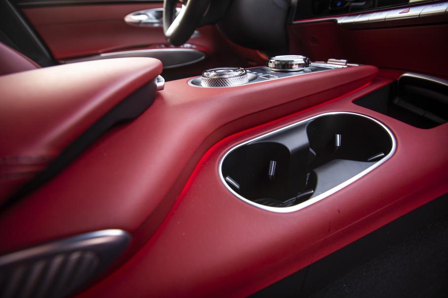 Красный салон по определению выглядит вызывающе. Но сдержанно-благородный оттенок бордо в GV70 не заставляет всякий раз вспоминать пошлый анекдот про чёрный Cayenne на красной коже