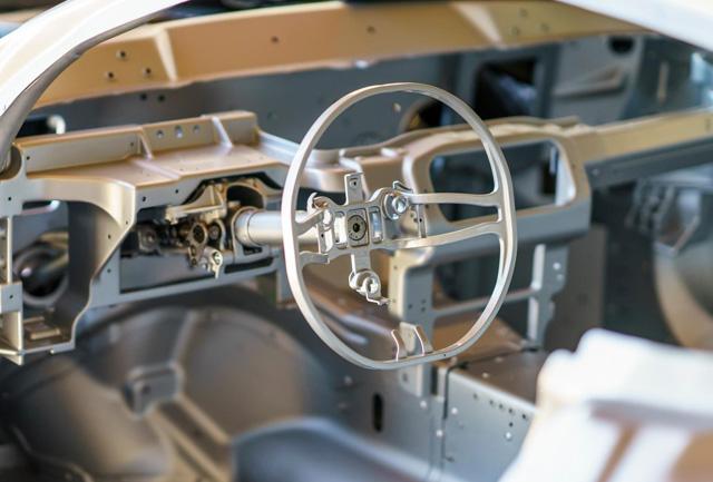 Легкий алюминиевый капот поднимается вверх вместе с крыльями, как у гоночного прототипа, глядя на мир слепыми отверстиями на месте фар, и это одна из самых больших в мире кузовных деталей в принципе.