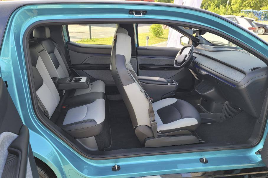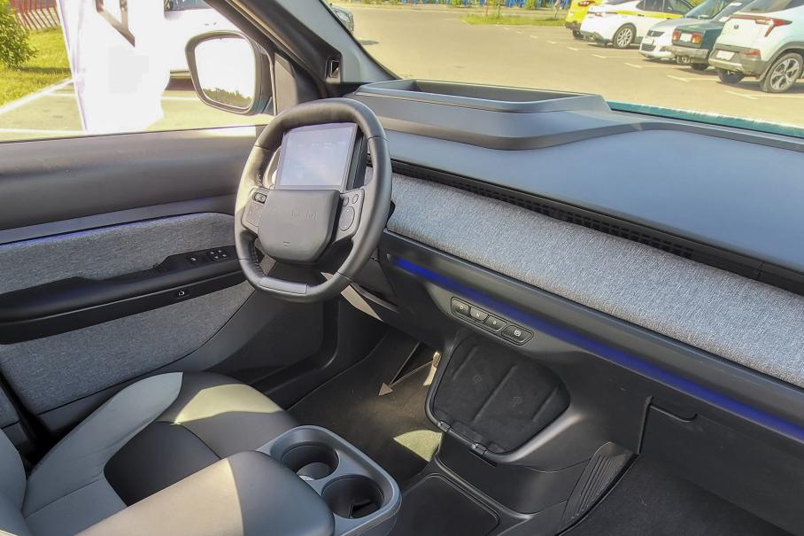 В интерьере царит минимализм: минимум поверхностей, текстур, оттенков, органов управления и даже стоек кузова. Количество столь модных сегодня мониторов также сведено к одной единице — и та расположена на руле. Решение, на мой взгляд, столь же неоднозначное, сколь и оригинальное (это справедливо и для конструкции дверей). Получается, что все экраны (заявлен ещё проекционный) адресованы одному лишь водителю, в то время как пассажирам остаётся лишь управление голосом. Современно, но и альтернативы не оставляет.