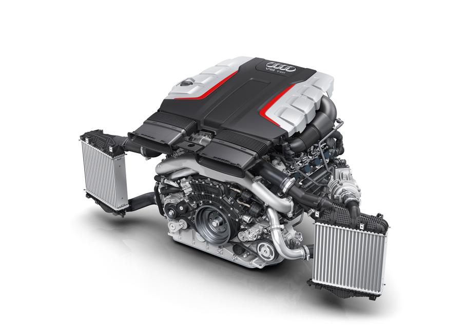 Общий вид двигателя 4.0 TDI: электрический компрессор установлен после правого радиатора интеркулера