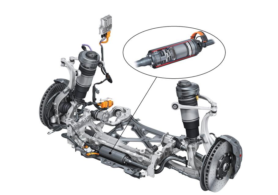 Так выглядит компоновка 48-вольтовой сети, в которую входят активные электромеханические стабилизаторы, электрический компрессор и стартер-генератор. Батарея расположена в правой части багажника