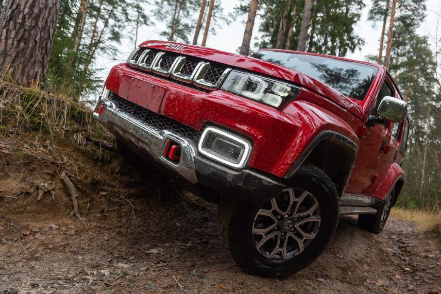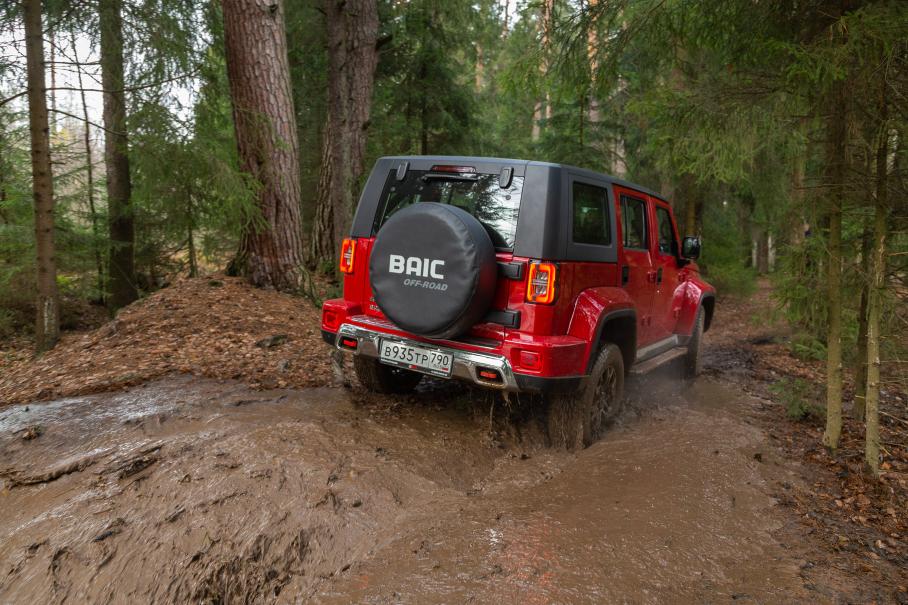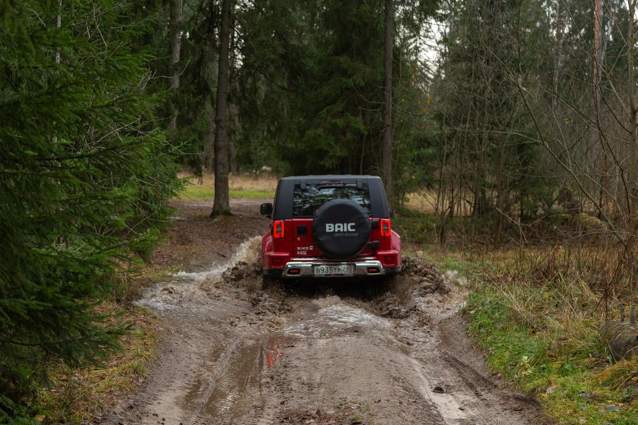Но если не совершать глупых ошибок, то на бездорожье можно чувствовать себя довольно уверенно. Даже в отсутствие механических блокировок BAIC BJ40 уверенно преодолевает препятствия разных типов. Так, в глубокой луже с илистым дном хорошо работают плоское днище, мощная тяга пониженного ряда и оперативно срабатывающие имитации блокировки. А выбраться из жижи через высокую ступеньку рельефа помогает великолепный показатель угла въезда: 37 градусов у BJ40 это не только лучше 33 у Tank 300, но и даже чуть круче Рэнглера с его 36 градусами.