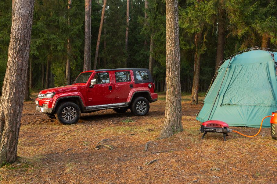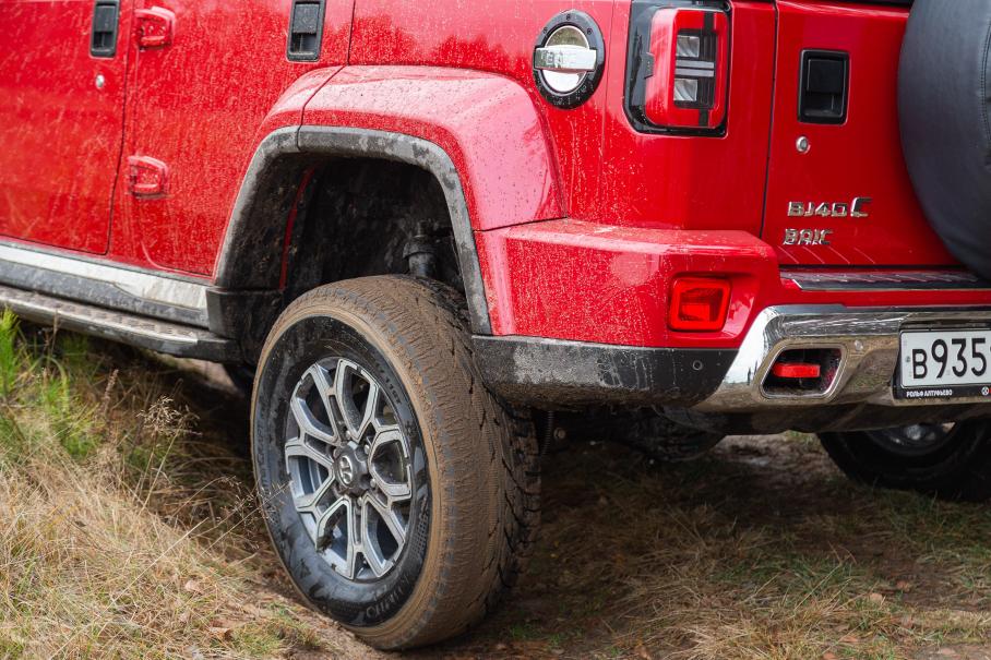 Правда, остальные значения внедорожной геометрии у BAIC не настолько выдающиеся: клиренс, углы съезда и рампы равны соответственно 210 мм, 31 и 23 градуса, тогда как у Tank 300 это 224, 34 и 23. И даже с такими цифрами вполне можно ехать искать пусть и небольшие, но уже по-настоящему внедорожные приключения. Особенно если установить зубастые АТ или вообще грязевые шины: штатный размер здесь 30,5 дюйма, но вот по поводу 32 или 33 без примерки сказать сложно. Визуально расположение колёс в арках очень похоже на Tank 300, поэтому базово в этом вопросе можно ориентироваться на конкурента.
