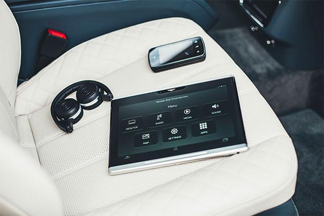 Это одна из двух игрушек для заднего пассажира – на экран пульта можно вывести много разного: показания спидометра, термометра, часы. Он способен управлять аудиосистемой, двигать сиденье переднего пассажира, менять режимы работы климат-контроля… Но, так как возможности пульта ограничены, он быстро надоедает. И тогда приходит время развлечься с одним из двух съемных планшетов, расположенных на спинках передних кресел. Эти гаджеты с диагональю 10,2 дюйма носят логотип Bentley (хотя и выпускаются в Тайване), поддерживают скоростной протокол 4G и используют операционную систему Android, которая позволяет закачивать любые приложения, используя планшет для работы или игр. Из предустановленных опций здесь можно найти интересное приложение Vanity mirror, которое превращает экран в огромное зеркало с помощью фронтальной камеры. Оставив его в слоте сиденья на зарядке, можно вывести на экран карту навигатора, смотреть кино или копаться в настройках автомобиля.