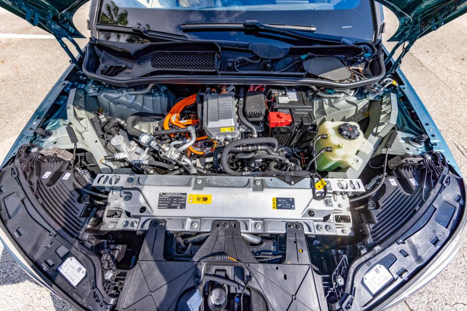 Однако капот всё-таки открывается. Для этого необходимо дернуть два веревочных хлястика с водительской и пассажирской стороны. После чего взору открывается подкапотное пространство, которое мало чем отличается от моторного отсека обычного автомобиля с ДВС. Возникает вопрос: «Холмс... Но, черт возьми, как?» Что такого лишнего есть в iX, чего нет в Тесле, что не позволило освободить место под капотом? Впрочем, очень много всего. Так что не станем упрекать немецких инженеров в том, что передний мотор они разместили под капотом, как и делают уже лет сто.